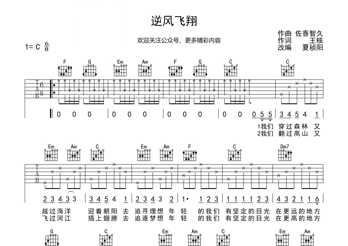 《逆风飞翔》,本吉他谱采用的是C调指法编配,这份吉他谱共有两张高清图谱,图谱由 @梦马音乐官方 编配上传,图谱使用六线谱编配,包含吉他和弦指法、简谱以及歌词部分,使用这份逆风飞翔吉他谱,可以让你更加方便地掌握这首歌曲的弹唱技巧,快来尝试吧。《逆风飞翔》吉他谱_C调吉他弹唱谱。