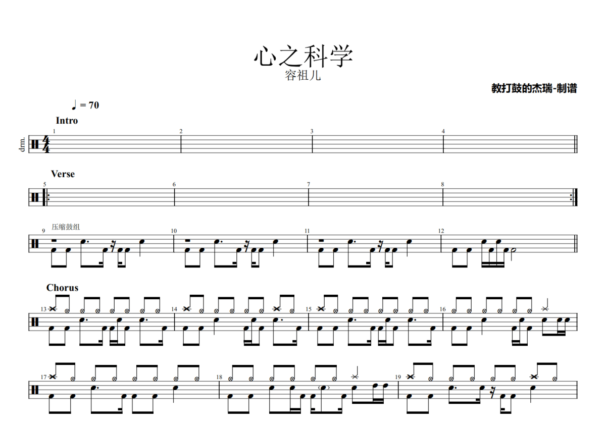 《心之科学》是容祖儿演唱的一首歌曲,这份鼓谱共有两张高清图谱,图谱由 @Jerry 编配上传,图谱使用五线谱编配,使用这份心之科学架子鼓谱,你将能够轻松地敲打出这首容祖儿的心之科学,快来尝试吧。