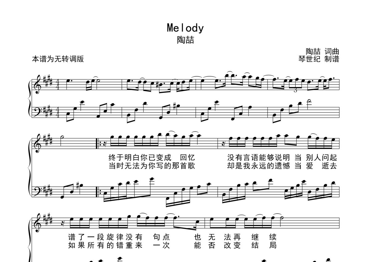 《Melody》是陶喆演唱的一首歌曲,五线谱,这份钢琴谱共有四张高清图谱,图谱由 @农村弹唱王 编配上传,曲谱配备了相关的音频提供试听,使用这份Melody钢琴谱,可以让你更加方便地掌握这首歌曲的演奏技巧,快来尝试吧。