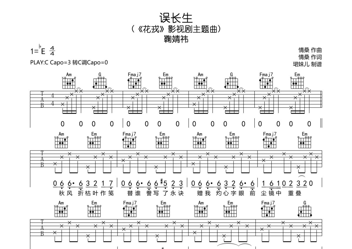 《误长生》是鞠婧祎演唱的一首歌曲,拍号为4/4拍,歌曲速度为每分钟85拍,歌曲原调为Eb调,但由于原调指法比较难,为了方便弹奏,本吉他谱采用的是C调指法编配,变调夹3品弹奏即为原调,当然也可以根据自己的音域改变变调夹位置,或者通过改变和弦调性,以方便自己弹奏,这份吉他谱共有两张高清图谱,图谱由 @珺妹儿 编配上传,图谱使用六线谱编配,包含吉他和弦指法、简谱以及歌词部分,使用这份误长生吉他谱,可以让你更加方便地掌握这首歌曲的弹唱技巧,快来尝试吧。