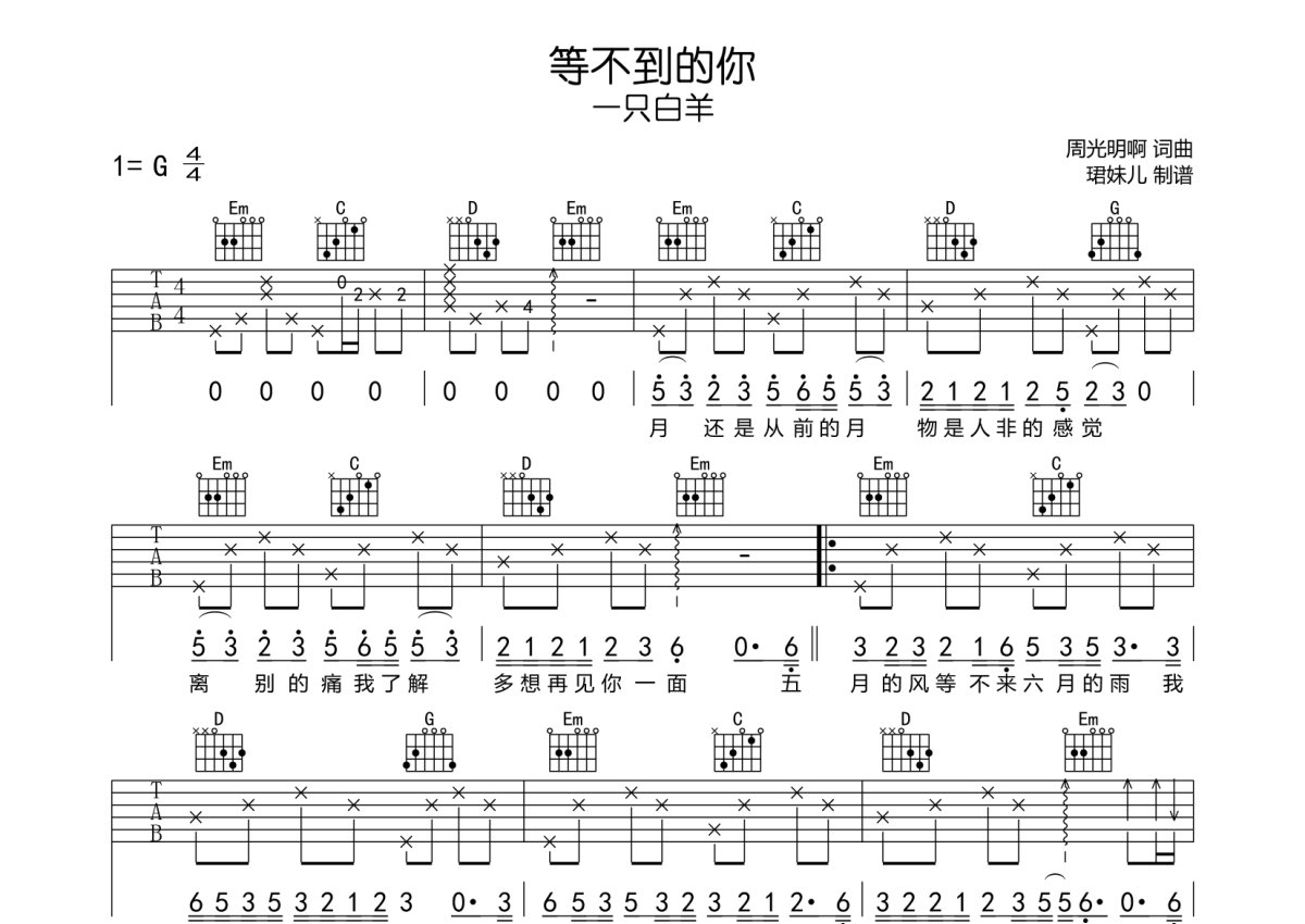 一只白羊《等不到的你》吉他谱 - G调弹唱六线谱