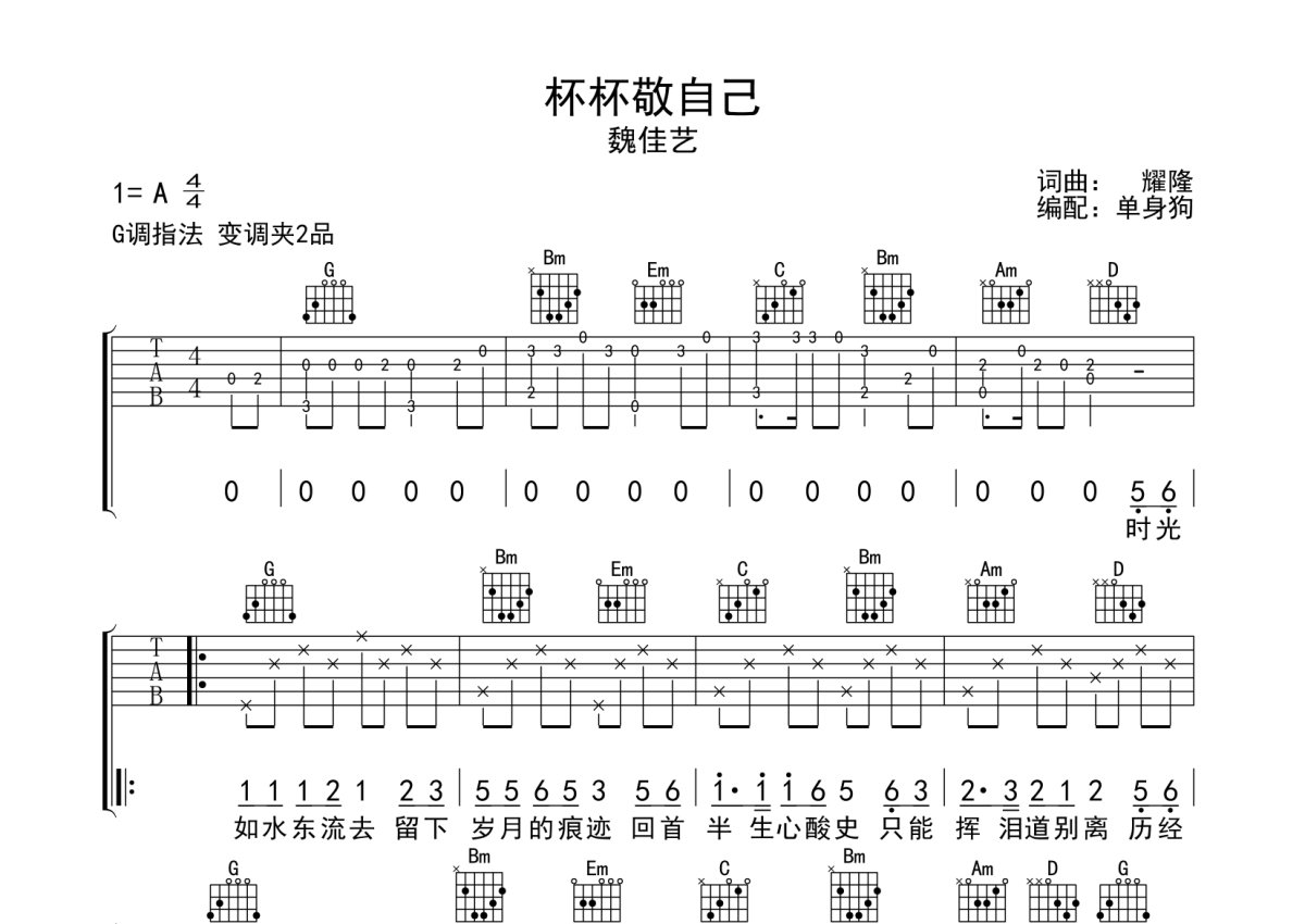 魏佳艺《杯杯敬自己》吉他谱 - G调弹唱六线谱