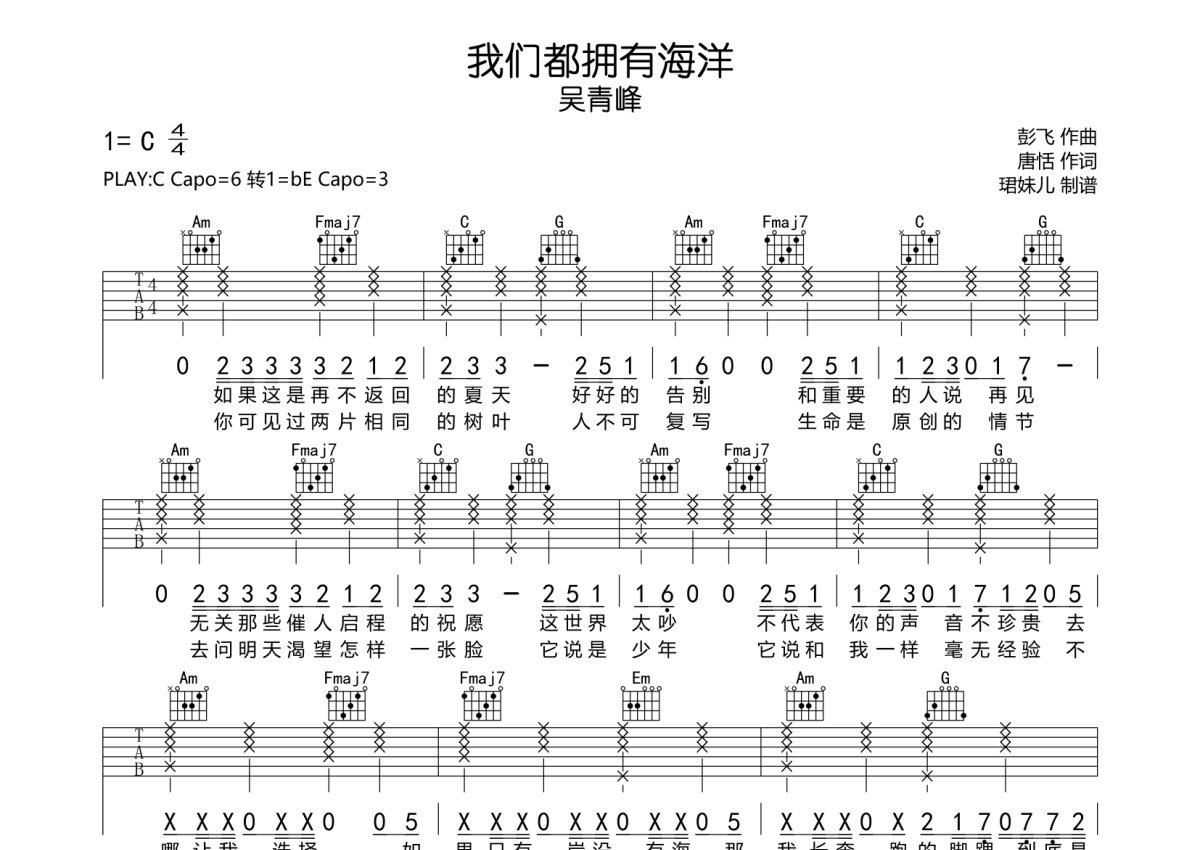 《我们都拥有海洋》是吴青峰演唱的一首歌曲,拍号为4/4拍,歌曲速度为每分钟85拍,歌曲原调为Gb调,但由于原调指法比较难,为了方便弹奏,本吉他谱采用的是C调指法编配,变调夹6品弹奏即为原调,当然也可以根据自己的音域改变变调夹位置,或者通过改变和弦调性,以方便自己弹奏,这份吉他谱共有两张高清图谱,图谱由 @珺妹儿 编配上传,图谱使用六线谱编配,包含吉他和弦指法、简谱以及歌词部分,使用这份我们都拥有海洋吉他谱,可以让你更加方便地掌握这首歌曲的弹唱技巧,快来尝试吧。此谱有转调。