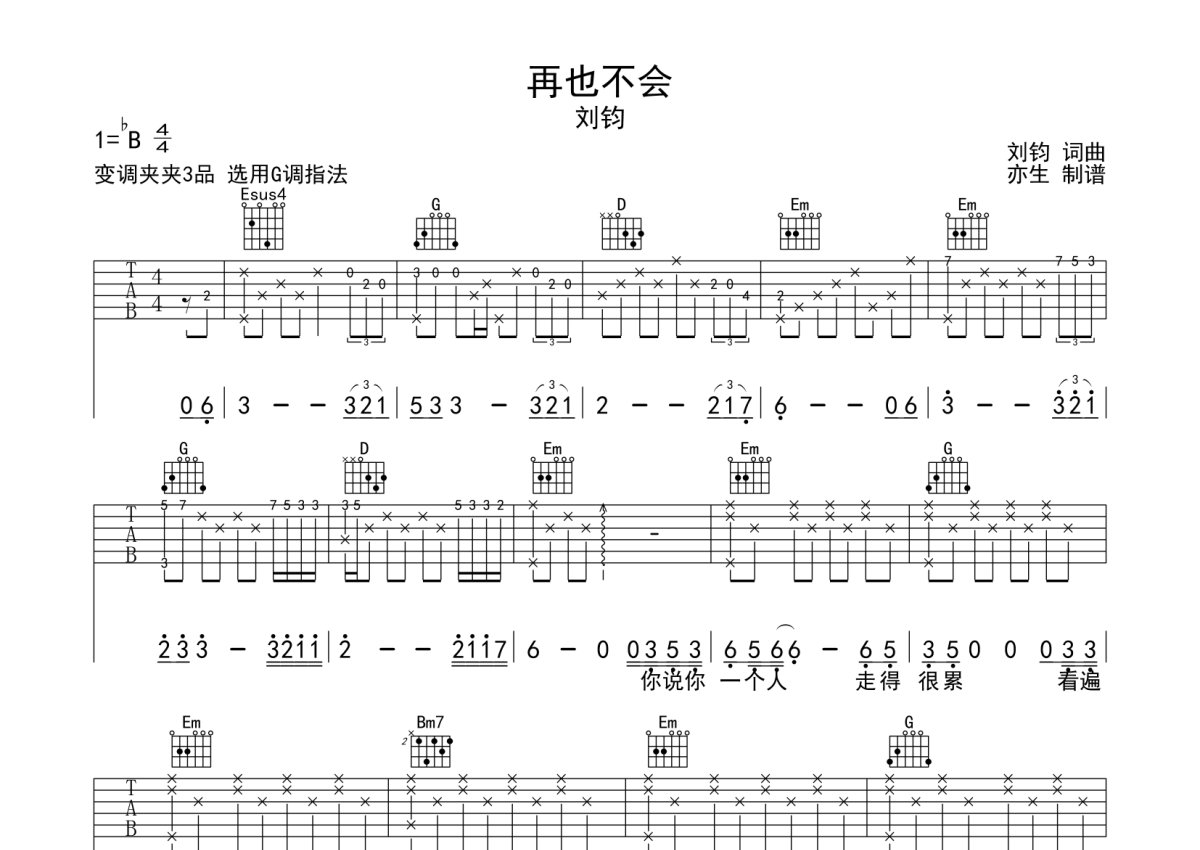 刘钧《再也不会》吉他谱 - G调弹唱六线谱