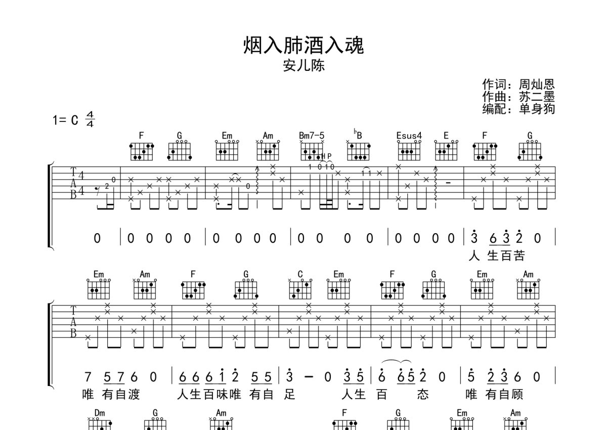 安儿陈《烟入肺酒入魂》吉他谱 - C调弹唱六线谱