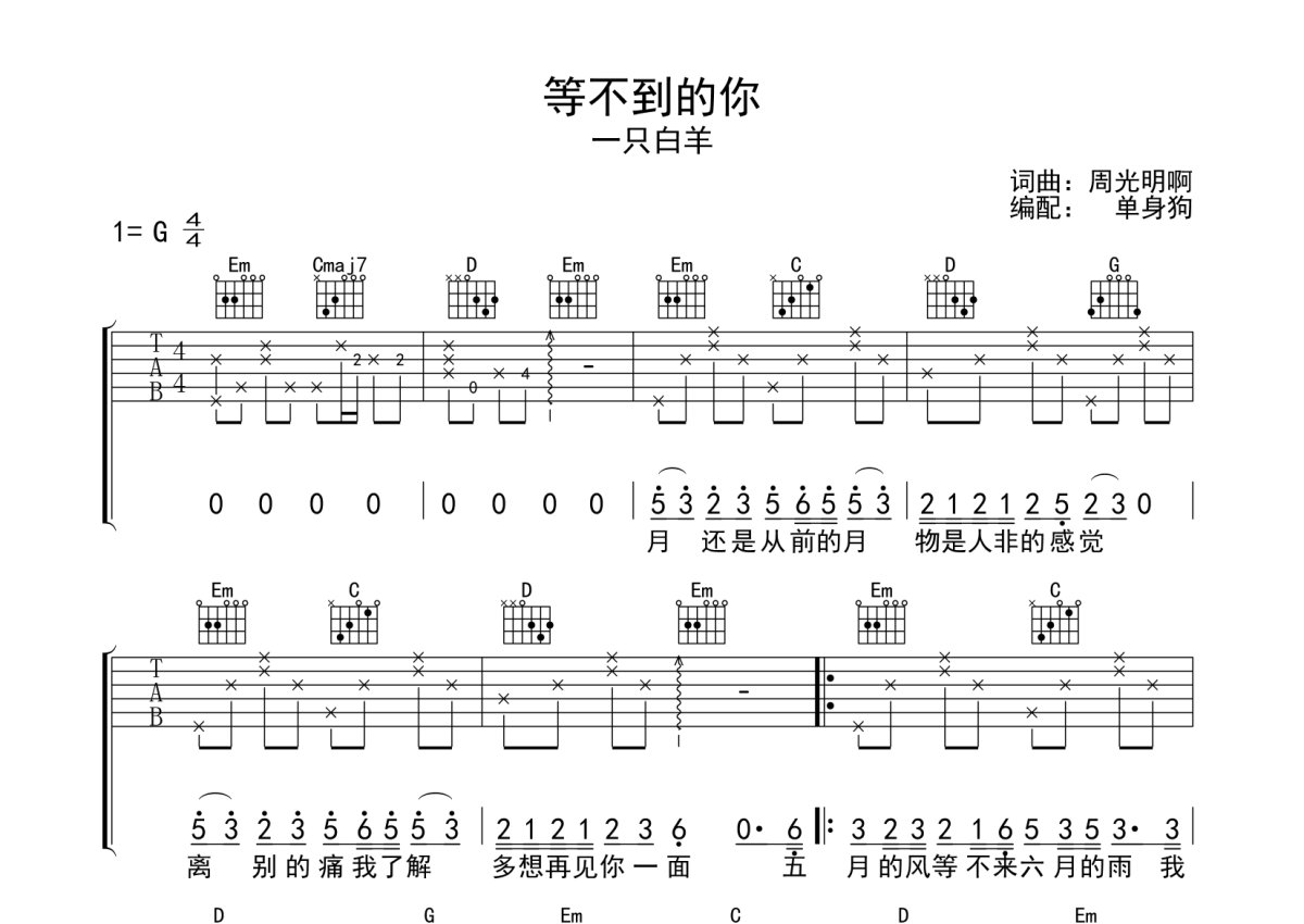 一只白羊《等不到的你》吉他谱 - G调弹唱六线谱