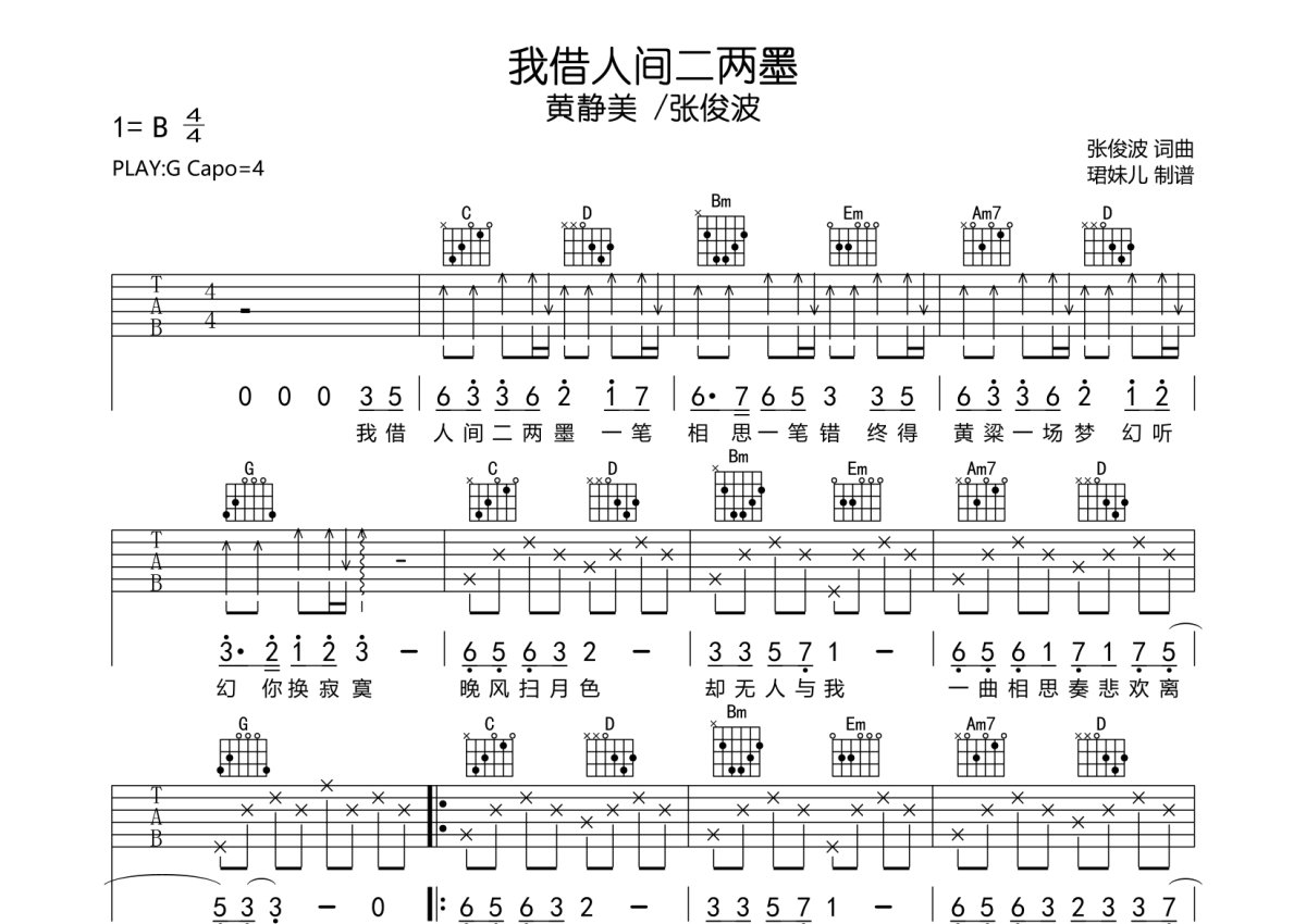 《我借人间二两墨》是L(桃籽) /周林枫 /三楠演唱的一首歌曲,拍号为4/4拍,歌曲速度为每分钟85拍,歌曲原调为B调,但由于原调指法比较难,为了方便弹奏,本吉他谱采用的是G调指法编配,变调夹4品弹奏即为原调,当然也可以根据自己的音域改变变调夹位置,或者通过改变和弦调性,以方便自己弹奏,这份吉他谱共有两张高清图谱,图谱由 @珺妹儿 编配上传,图谱使用六线谱编配,包含吉他和弦指法、简谱以及歌词部分,使用这份我借人间二两墨吉他谱,可以让你更加方便地掌握这首歌曲的弹唱技巧,快来尝试吧。