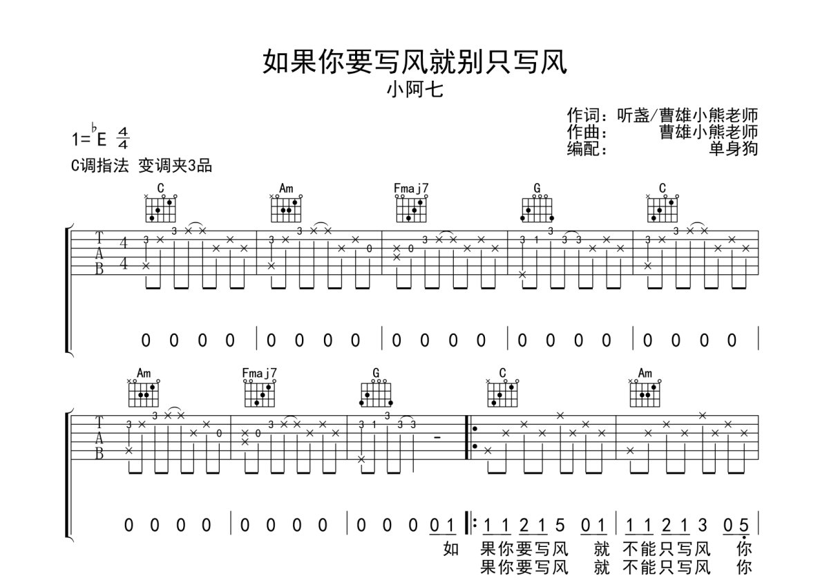 《如果你要写风就别只写风》是小阿七演唱的一首歌曲,拍号为4/4拍,歌曲原调为Eb调,但由于原调指法比较难,为了方便弹奏,本吉他谱采用的是C调指法编配,变调夹3品弹奏即为原调,当然也可以根据自己的音域改变变调夹位置,或者通过改变和弦调性,以方便自己弹奏,这份吉他谱共有三张高清图谱,图谱由 @单身狗 编配上传,图谱使用六线谱编配,包含吉他和弦指法、简谱以及歌词部分,使用这份如果你要写风就别只写风吉他谱,可以让你更加方便地掌握这首歌曲的弹唱技巧,快来尝试吧。
