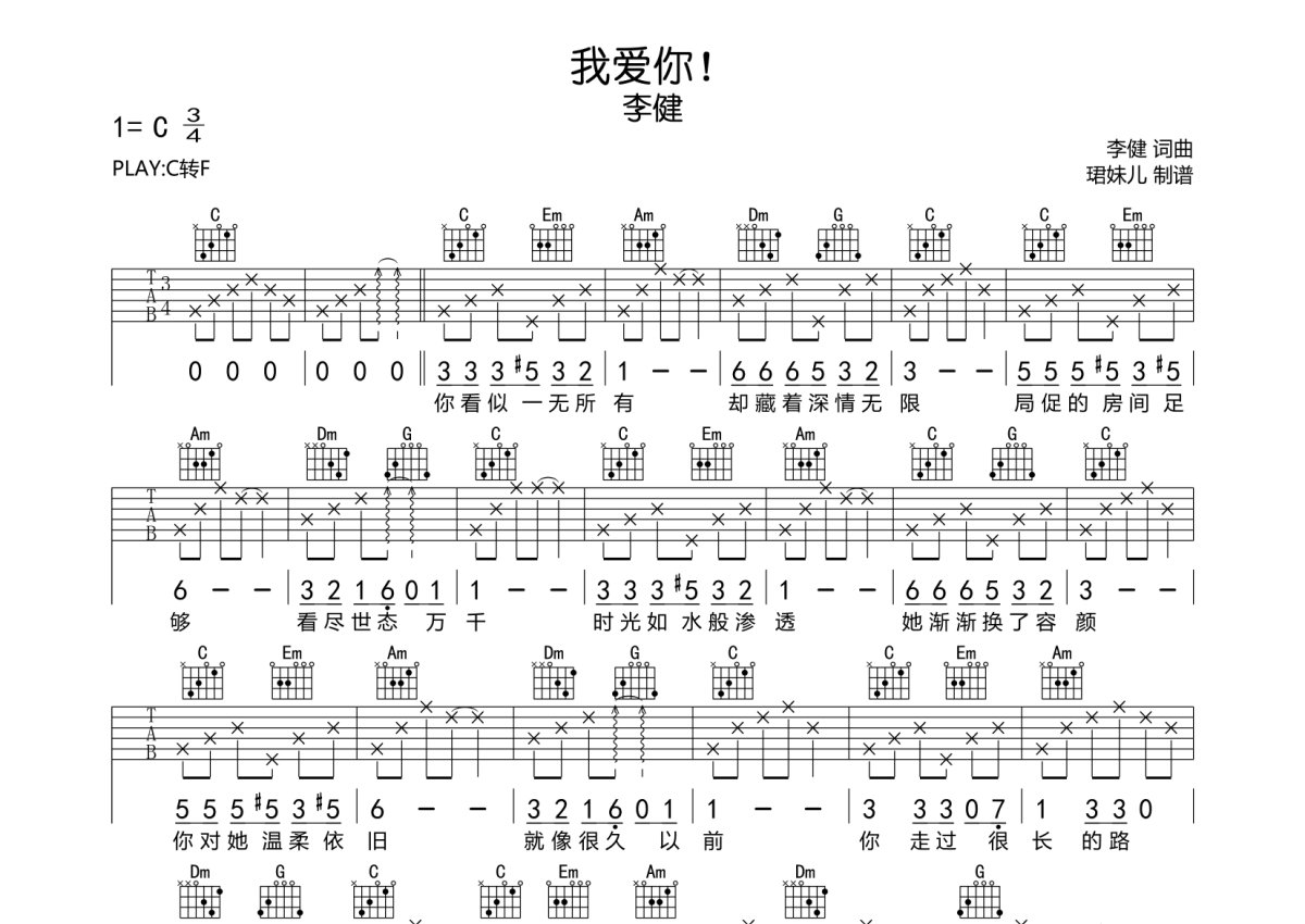 李健《我爱你!》吉他谱 - C调弹唱六线谱