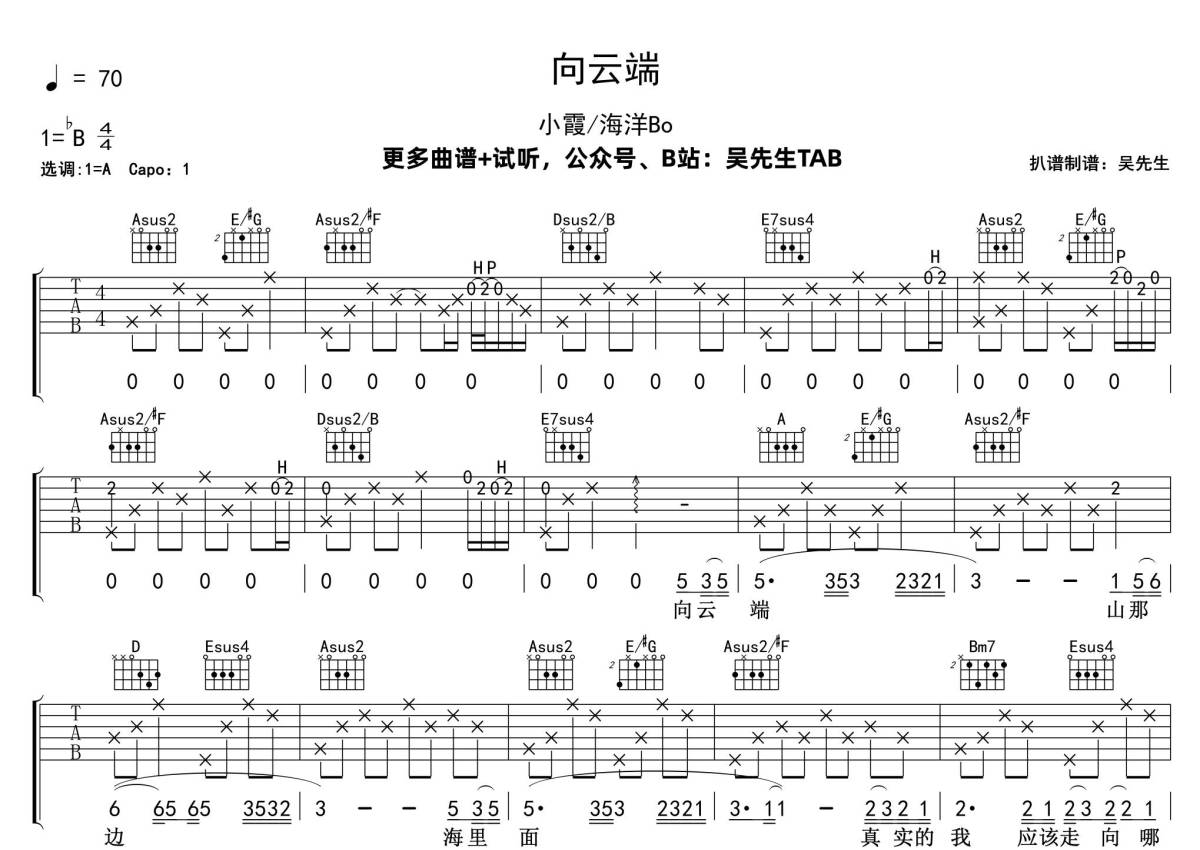 《向云端》是小霞 / 海洋Bo演唱的一首歌曲,拍号为4/4拍,歌曲速度为每分钟70拍,歌曲原调为Bb调,但由于原调指法比较难,为了方便弹奏,本吉他谱采用的是A调指法编配,变调夹1品弹奏即为原调,当然也可以根据自己的音域改变变调夹位置,或者通过改变和弦调性,以方便自己弹奏,这份吉他谱共有三张高清图谱,图谱由 @吴先生TAB 编配上传,图谱使用六线谱编配,包含吉他和弦指法、简谱以及歌词部分,曲谱配备了相关的音频提供试听,使用这份向云端吉他谱,可以让你更加方便地掌握这首歌曲的弹唱技巧,快来尝试吧。此谱并无rap歌词部分。