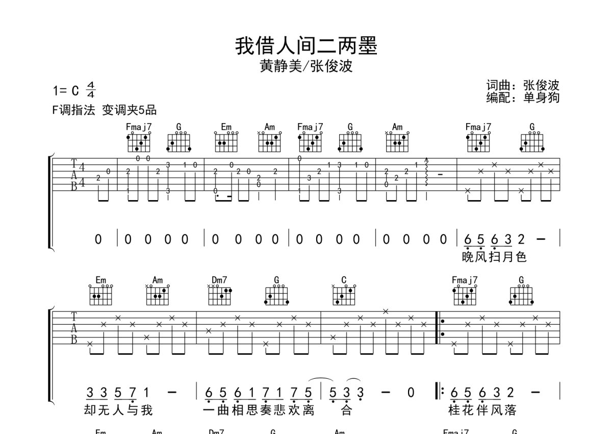 黄静美/张俊波《我借人间二两墨》吉他谱 - C调弹唱六线谱