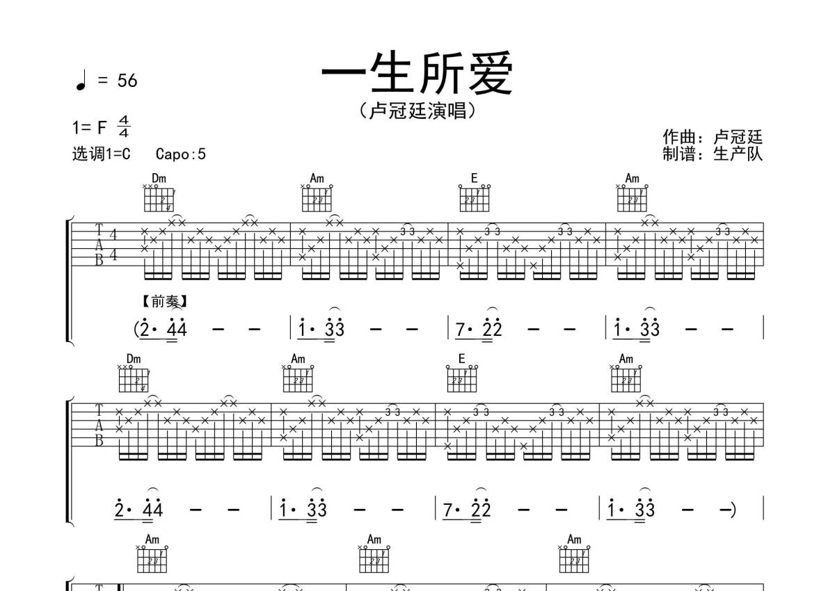 卢冠廷《一生所爱》吉他谱 - C调弹唱六线谱