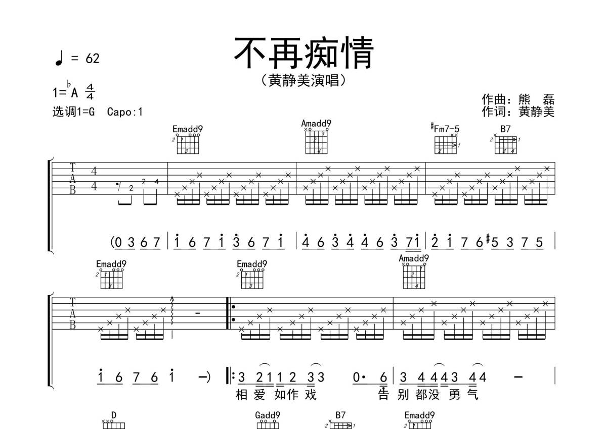 《不再痴情》是黄静美演唱的一首歌曲,拍号为4/4拍,歌曲速度为每分钟62拍,本吉他谱采用的是G调指法编配,变调夹1品弹奏即为原调,当然也可以根据自己的音域改变变调夹位置,或者通过改变和弦调性,以方便自己弹奏,这份吉他谱共有三张高清图谱,图谱由 @生产队 编配上传,图谱使用六线谱编配,包含吉他和弦指法、简谱以及歌词部分,使用这份不再痴情吉他谱,可以让你更加方便地掌握这首歌曲的弹唱技巧,快来尝试吧。
