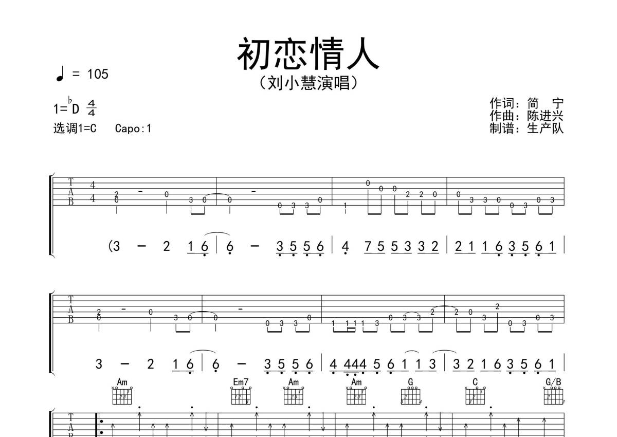 《初恋情人》是刘小慧演唱的一首歌曲,拍号为4/4拍,歌曲速度为每分钟105拍,歌曲原调为Db调,但由于原调指法比较难,为了方便弹奏,本吉他谱采用的是C调指法编配,变调夹1品弹奏即为原调,当然也可以根据自己的音域改变变调夹位置,或者通过改变和弦调性,以方便自己弹奏,这份吉他谱共有三张高清图谱,图谱由 @生产队 编配上传,图谱使用六线谱编配,包含吉他和弦指法、简谱以及歌词部分,使用这份初恋情人吉他谱,可以让你更加方便地掌握这首歌曲的弹唱技巧,快来尝试吧。