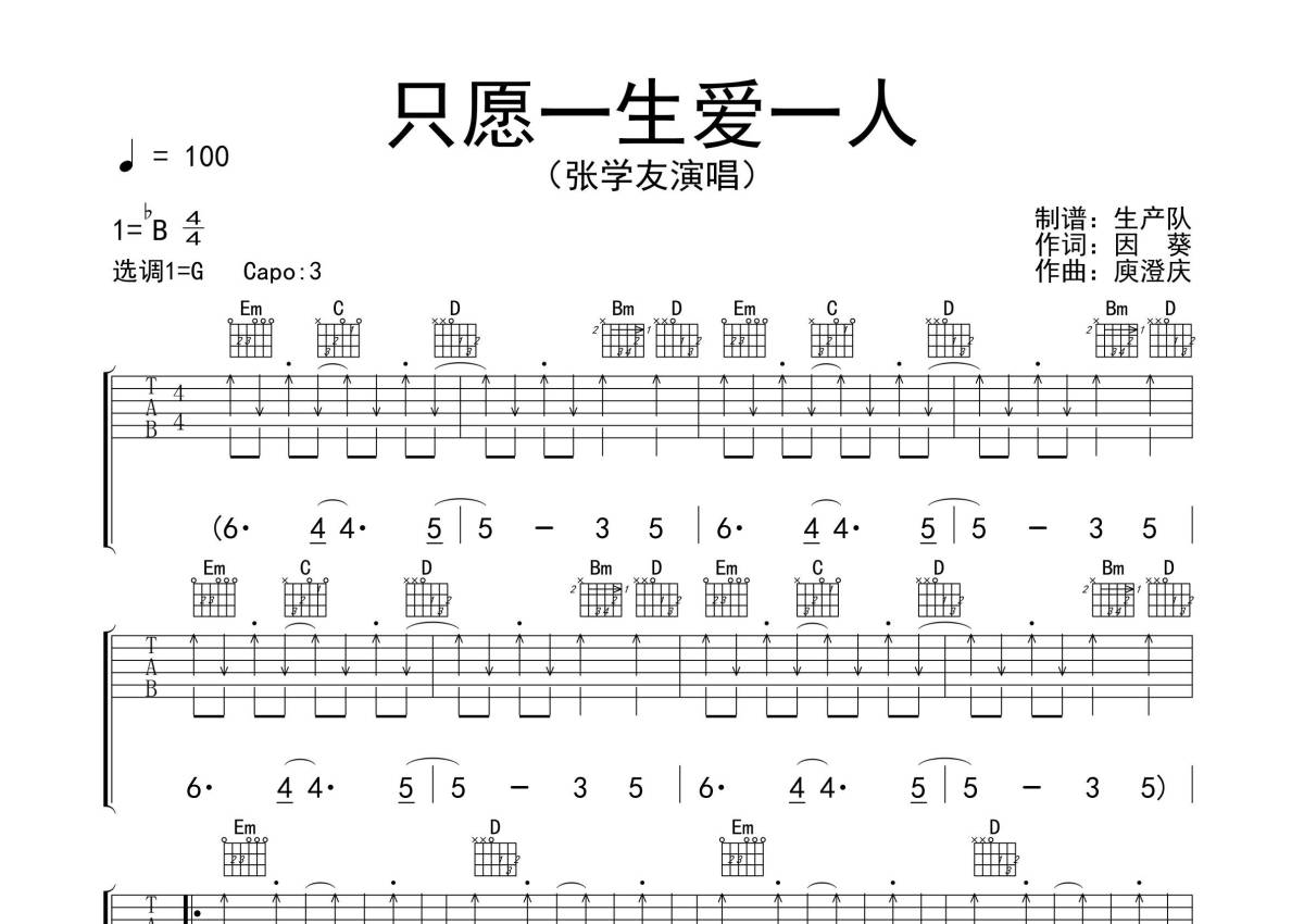 《只愿一生爱一人》是张学友演唱的一首歌曲,拍号为4/4拍,歌曲速度为每分钟100拍,歌曲原调为Bb调,但由于原调指法比较难,为了方便弹奏,本吉他谱采用的是G调指法编配,变调夹3品弹奏即为原调,当然也可以根据自己的音域改变变调夹位置,或者通过改变和弦调性,以方便自己弹奏,这份吉他谱共有三张高清图谱,图谱由 @生产队 编配上传,图谱使用六线谱编配,包含吉他和弦指法、简谱以及歌词部分,使用这份只愿一生爱一人吉他谱,可以让你更加方便地掌握这首歌曲的弹唱技巧,快来尝试吧。