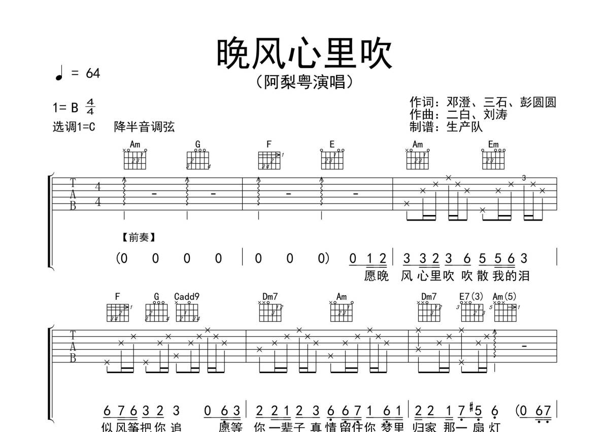 阿梨粤《晚风心里吹》吉他谱 - C调弹唱六线谱