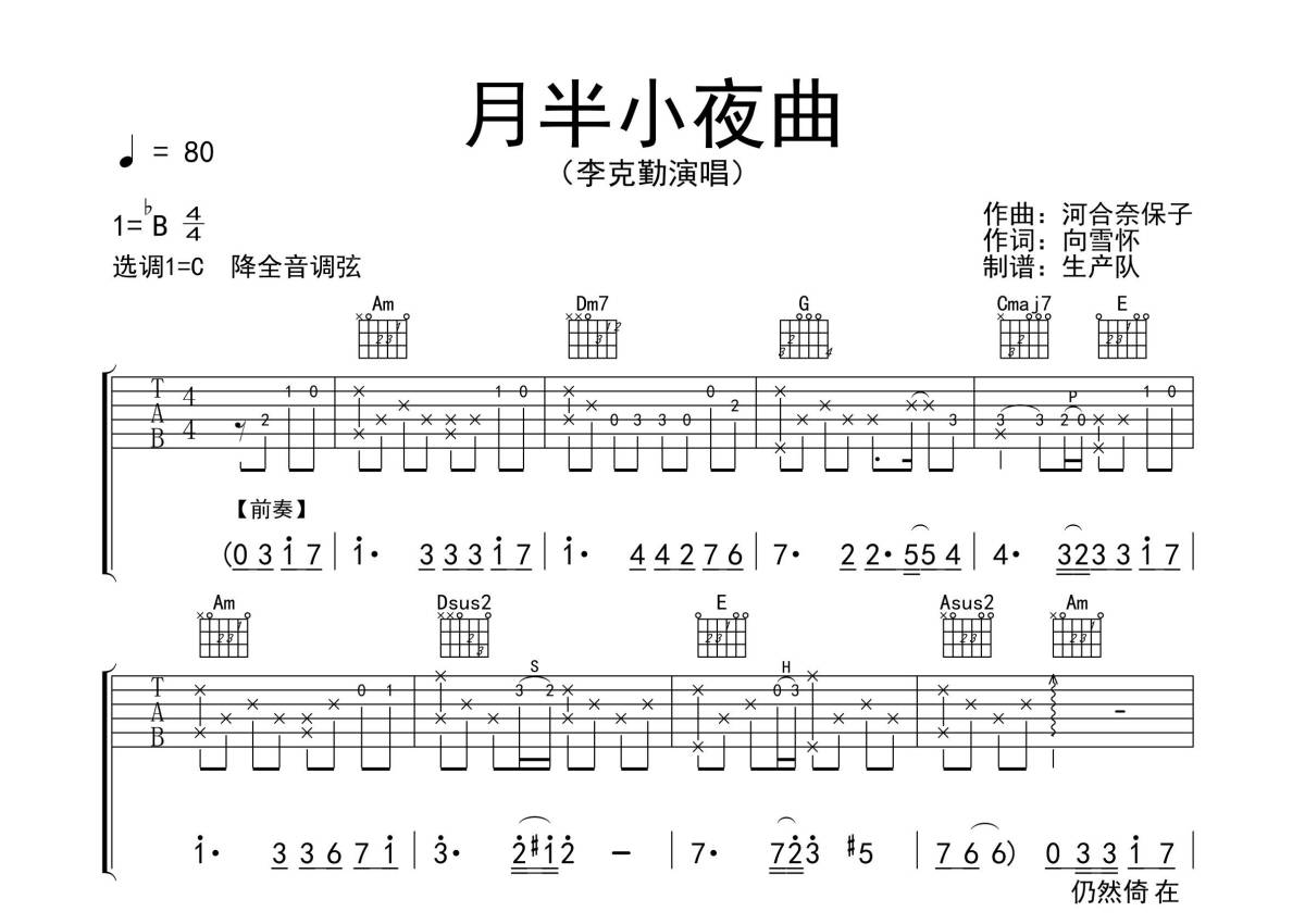 《月半小夜曲》是李克勤演唱的一首歌曲,拍号为4/4拍,歌曲速度为每分钟80拍,歌曲原调为Bb调,但由于原调指法比较难,为了方便弹奏,本吉他谱采用的是C调指法编配,降半音调弦弹奏即为原调,当然也可以根据自己的音域决定是否调弦,这份吉他谱共有四张高清图谱,图谱由 @生产队 编配上传,图谱使用六线谱编配,包含吉他和弦指法、简谱以及歌词部分,使用这份月半小夜曲吉他谱,可以让你更加方便地掌握这首歌曲的弹唱技巧,快来尝试吧。