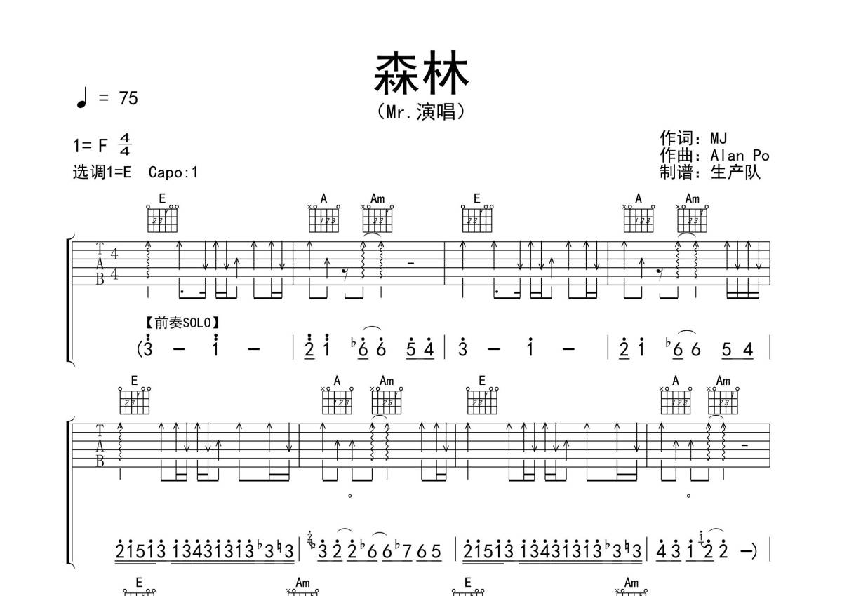 MR.《森林》吉他谱 - E调弹唱六线谱
