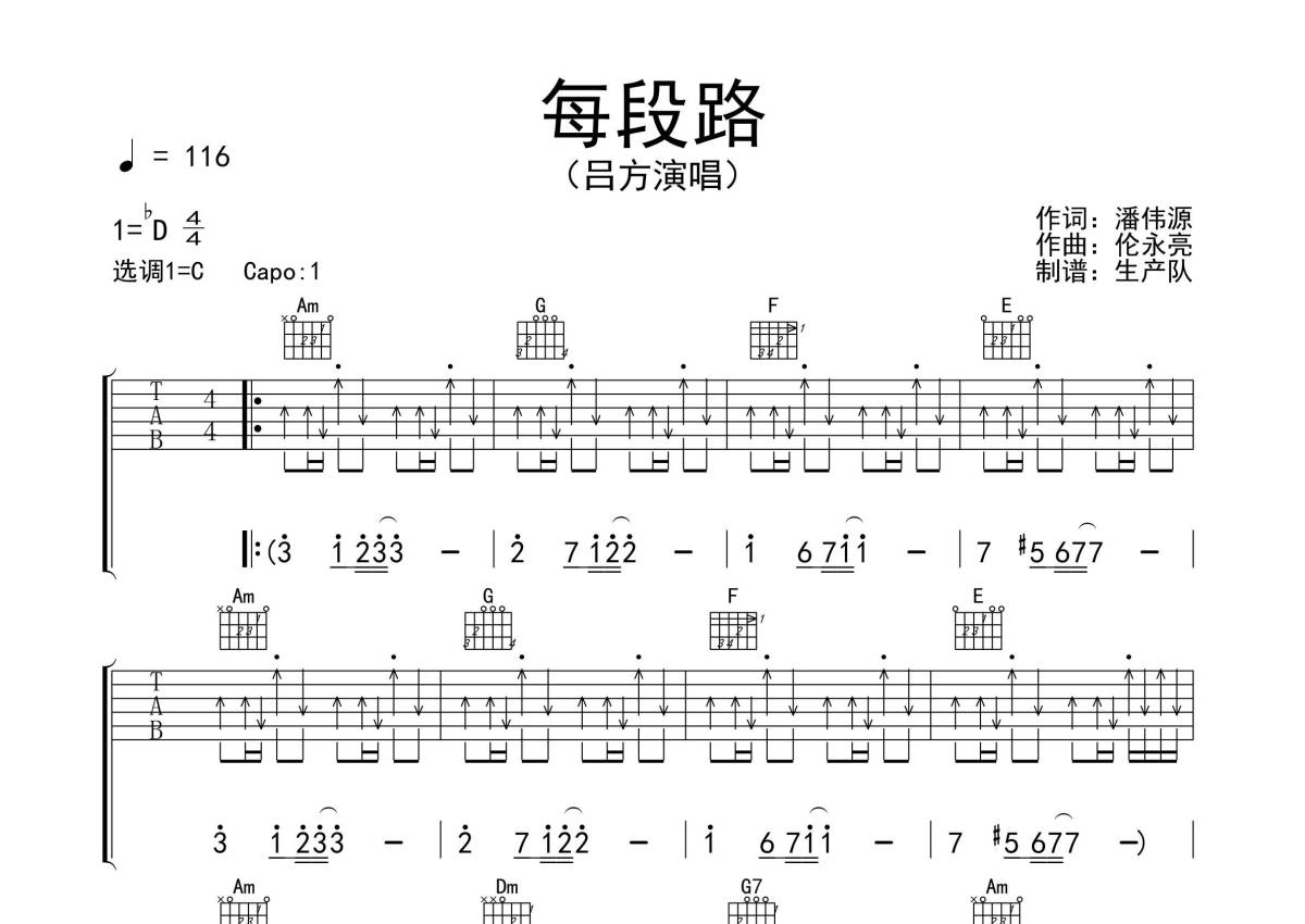 吕方《每段路》吉他谱 - C调弹唱六线谱