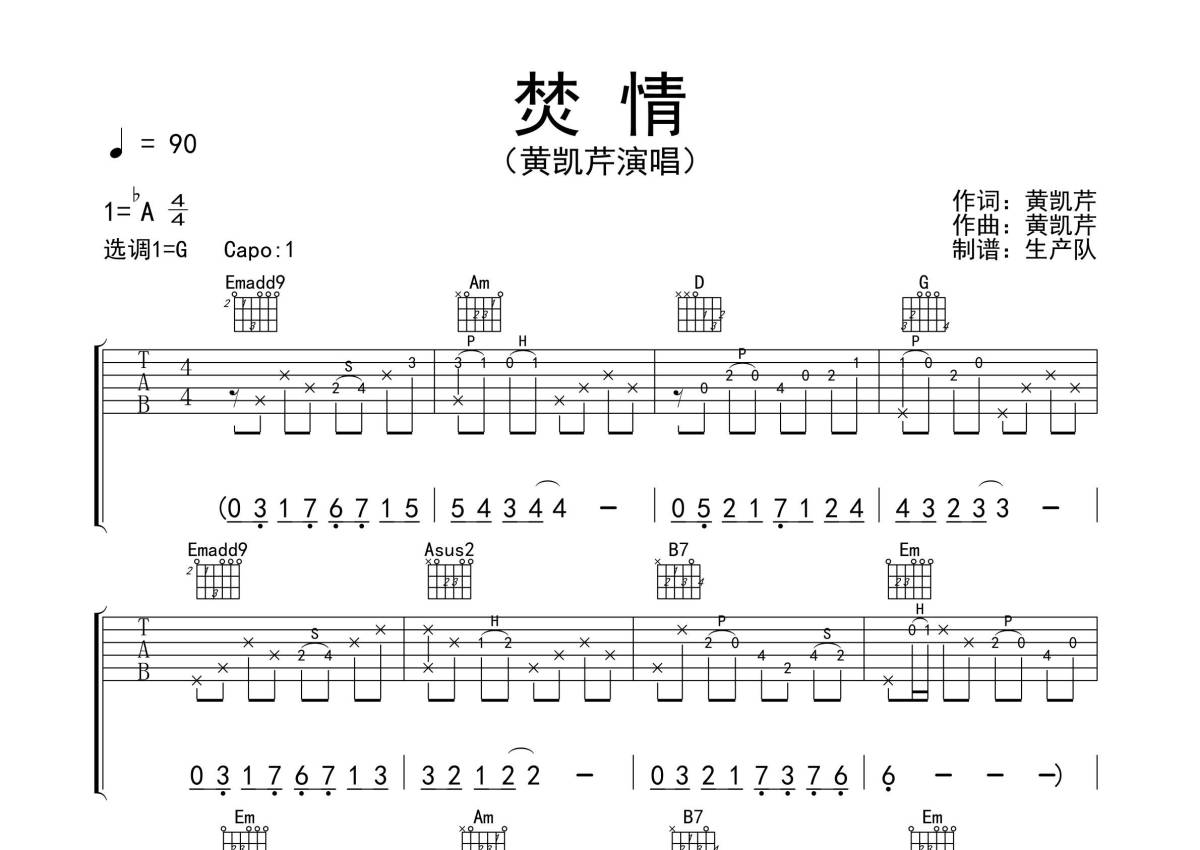 黄凯芹《焚情》吉他谱 - G调弹唱六线谱