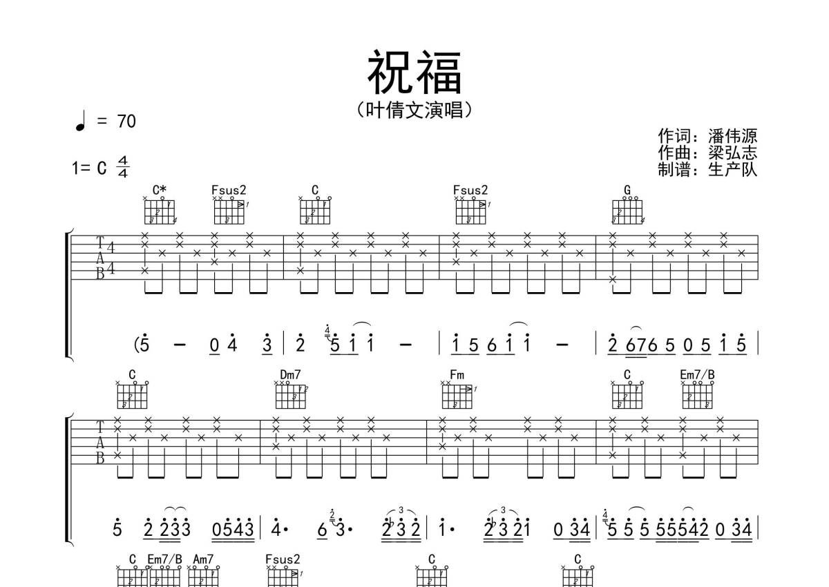 《祝福》是叶倩文演唱的一首歌曲,拍号为4/4拍,歌曲速度为每分钟70拍,歌曲原调为C调,本吉他谱采用的是C调指法编配,演奏时不需要使用变调夹即为原调,这份吉他谱共有三张高清图谱,图谱由 @生产队 编配上传,图谱使用六线谱编配,包含吉他和弦指法、简谱以及歌词部分,使用这份祝福吉他谱,可以让你更加方便地掌握这首歌曲的弹唱技巧,快来尝试吧。