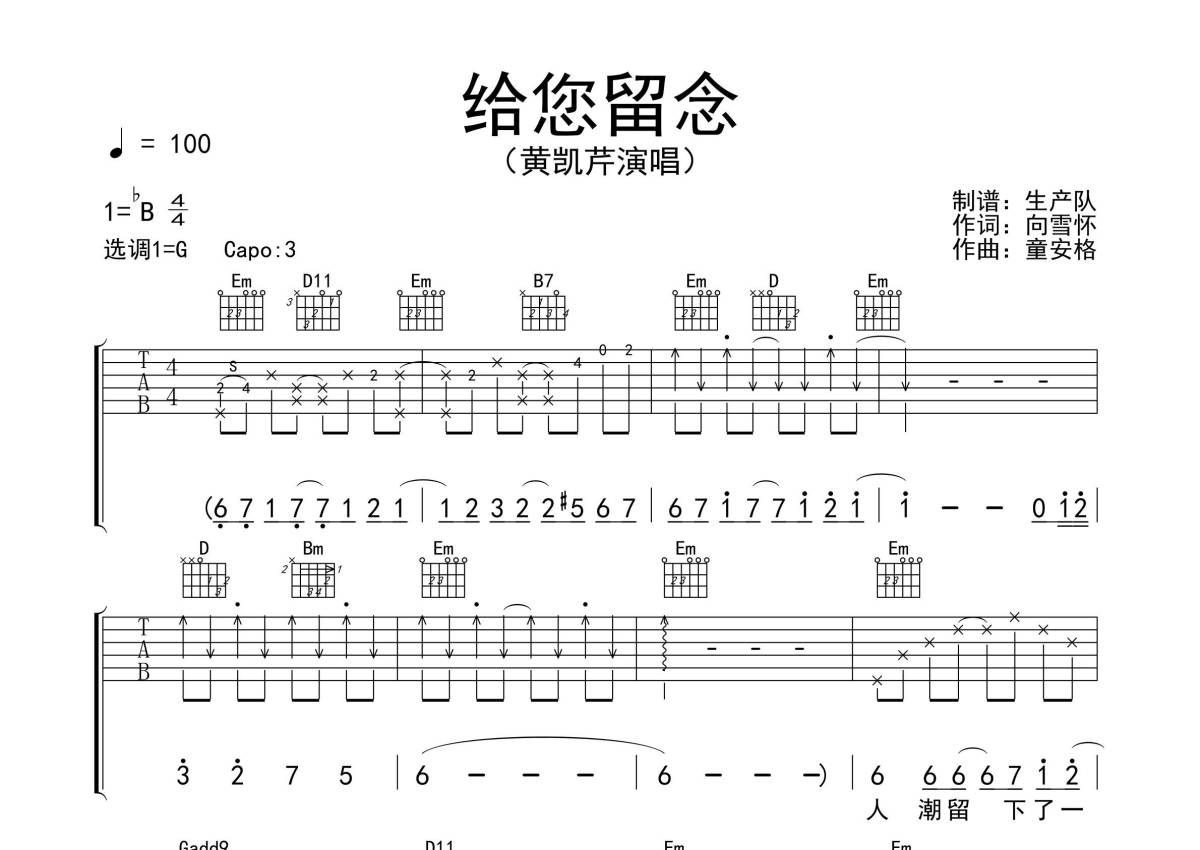《给您留念》是黄凯芹演唱的一首歌曲,拍号为4/4拍,歌曲速度为每分钟100拍,歌曲原调为Bb调,但由于原调指法比较难,为了方便弹奏,本吉他谱采用的是G调指法编配,变调夹3品弹奏即为原调,当然也可以根据自己的音域改变变调夹位置,或者通过改变和弦调性,以方便自己弹奏,这份吉他谱共有四张高清图谱,图谱由 @生产队 编配上传,图谱使用六线谱编配,包含吉他和弦指法、简谱以及歌词部分,使用这份给您留念吉他谱,可以让你更加方便地掌握这首歌曲的弹唱技巧,快来尝试吧。