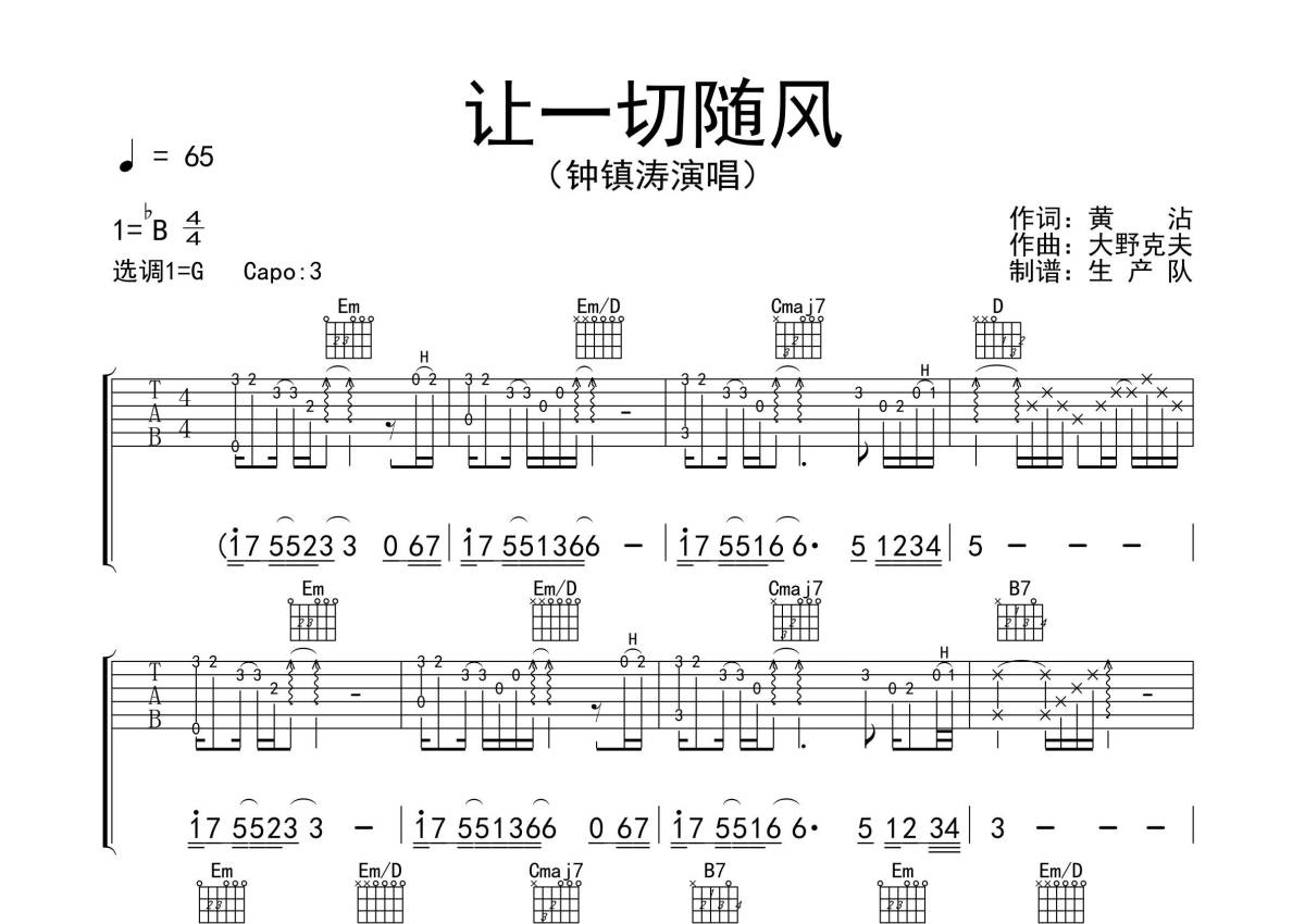 《让一切随风》是钟镇涛演唱的一首歌曲,拍号为4/4拍,歌曲速度为每分钟65拍,歌曲原调为Bb调,但由于原调指法比较难,为了方便弹奏,本吉他谱采用的是G调指法编配,变调夹3品弹奏即为原调,当然也可以根据自己的音域改变变调夹位置,或者通过改变和弦调性,以方便自己弹奏,这份吉他谱共有三张高清图谱,图谱由 @生产队 编配上传,图谱使用六线谱编配,包含吉他和弦指法、简谱以及歌词部分,使用这份让一切随风吉他谱,可以让你更加方便地掌握这首歌曲的弹唱技巧,快来尝试吧。