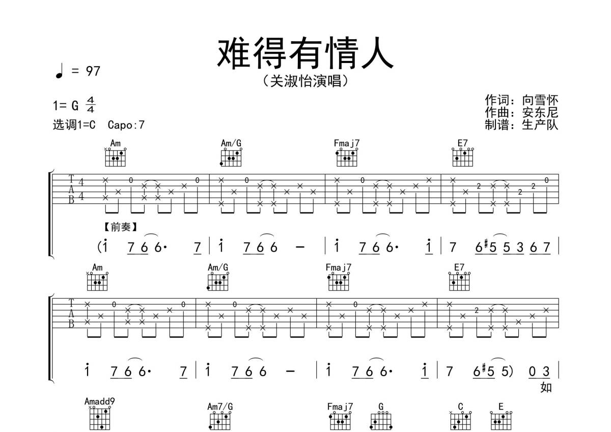 关淑怡《难得有情人》吉他谱 - C调弹唱六线谱