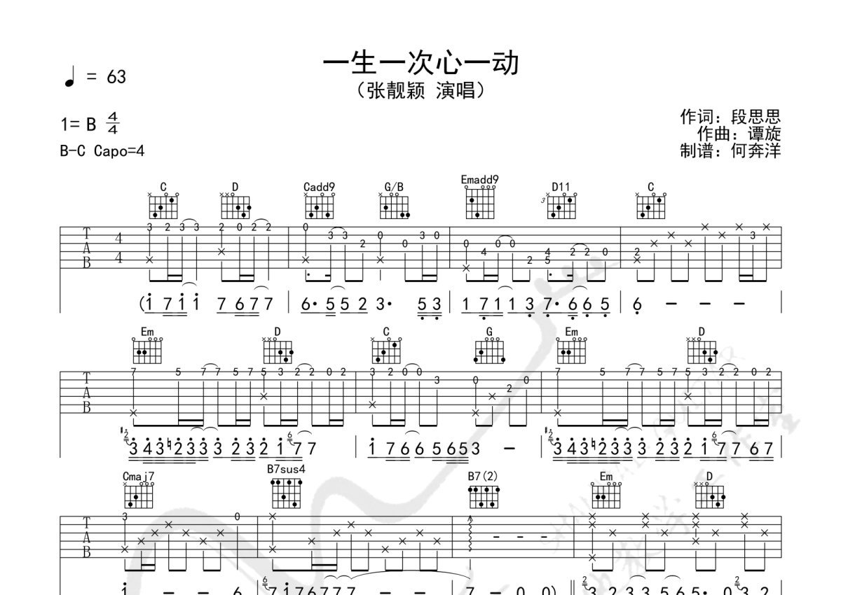 《一生一次心一动》是张靓颖演唱的一首歌曲,本吉他谱采用的是G调指法编配,这份吉他谱共有三张高清图谱,图谱由 @何奔洋 编配上传,图谱使用六线谱编配,包含吉他和弦指法、简谱以及歌词部分,使用这份一生一次心一动吉他谱,可以让你更加方便地掌握这首歌曲的弹唱技巧,快来尝试吧。张靓颖《一生一次心一动》吉他谱_G调吉他弹唱谱。