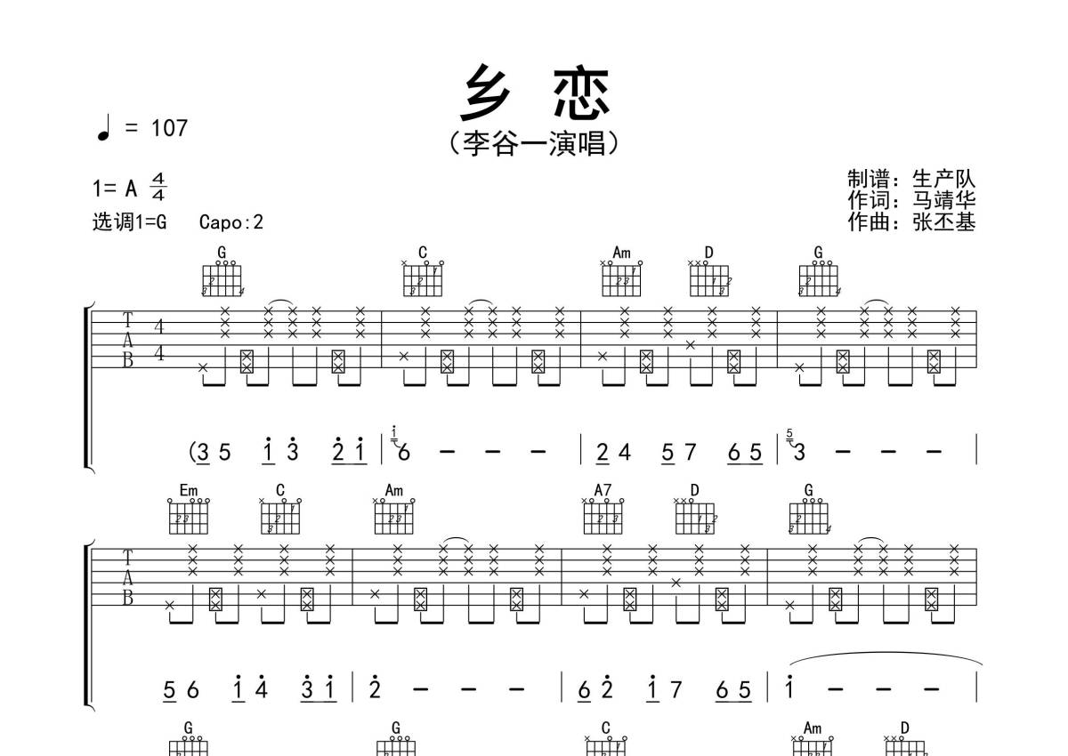 《乡恋》是李谷一演唱的一首歌曲,拍号为4/4拍,歌曲速度为每分钟107拍,歌曲原调为A调,但由于原调指法比较难,为了方便弹奏,本吉他谱采用的是G调指法编配,变调夹2品弹奏即为原调,当然也可以根据自己的音域改变变调夹位置,或者通过改变和弦调性,以方便自己弹奏,这份吉他谱共有三张高清图谱,图谱由 @生产队 编配上传,图谱使用六线谱编配,包含吉他和弦指法、简谱以及歌词部分,使用这份乡恋吉他谱,可以让你更加方便地掌握这首歌曲的弹唱技巧,快来尝试吧。