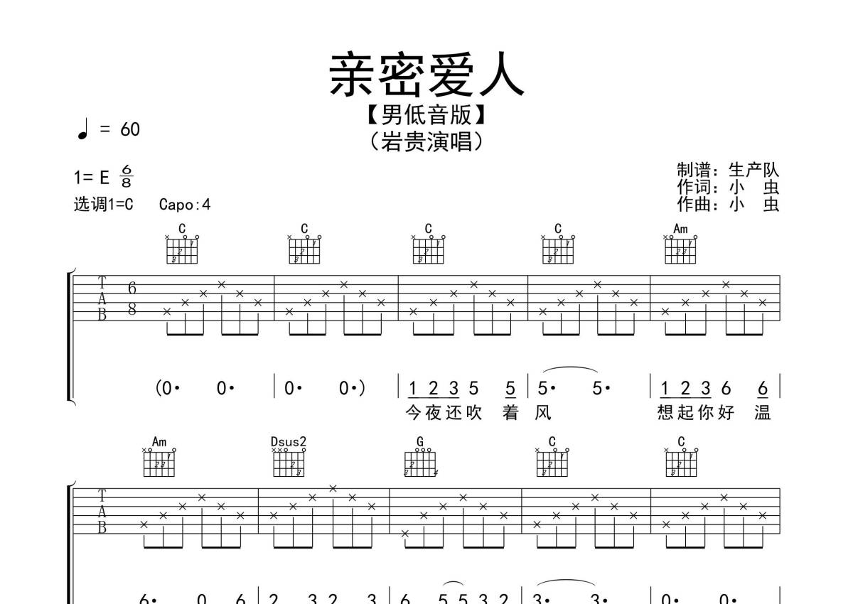 岩贵《亲密爱人》吉他谱 - C调弹唱六线谱