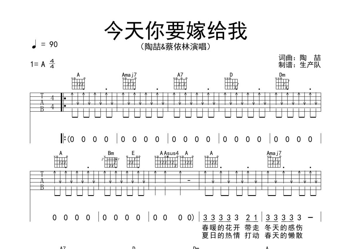 陶喆/蔡依林《今天你要嫁给我》吉他谱 - A调弹唱六线谱