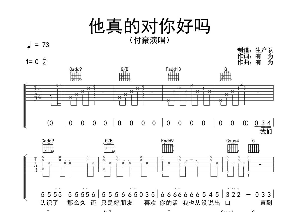 付豪《他真的对你好吗》吉他谱 - C调弹唱六线谱