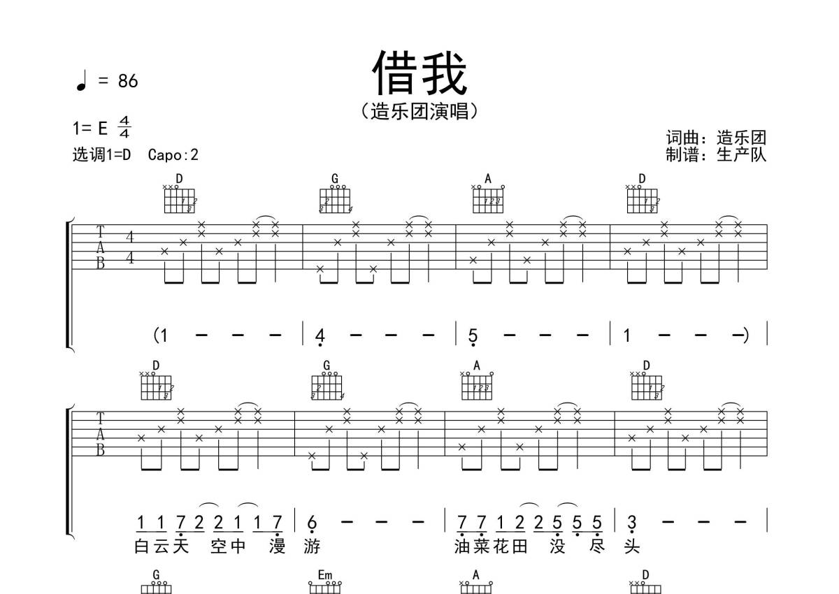 《借我》是造乐团演唱的一首歌曲,拍号为4/4拍,歌曲速度为每分钟86拍,歌曲原调为E调,但由于原调指法比较难,为了方便弹奏,本吉他谱采用的是D调指法编配,变调夹2品弹奏即为原调,当然也可以根据自己的音域改变变调夹位置,或者通过改变和弦调性,以方便自己弹奏,这份吉他谱共有四张高清图谱,图谱由 @生产队 编配上传,图谱使用六线谱编配,包含吉他和弦指法、简谱以及歌词部分,使用这份借我吉他谱,可以让你更加方便地掌握这首歌曲的弹唱技巧,快来尝试吧。