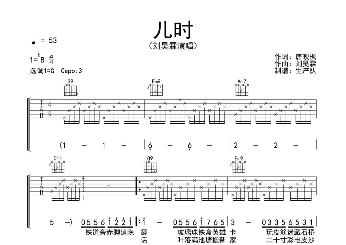 《儿时》是刘昊霖演唱的一首歌曲,拍号为4/4拍,歌曲速度为每分钟53拍,歌曲原调为Bb调,但由于原调指法比较难,为了方便弹奏,本吉他谱采用的是G调指法编配,变调夹3品弹奏即为原调,当然也可以根据自己的音域改变变调夹位置,或者通过改变和弦调性,以方便自己弹奏,这份吉他谱共有四张高清图谱,图谱由 @生产队 编配上传,图谱使用六线谱编配,包含吉他和弦指法、简谱以及歌词部分,使用这份儿时吉他谱,可以让你更加方便地掌握这首歌曲的弹唱技巧,快来尝试吧。
