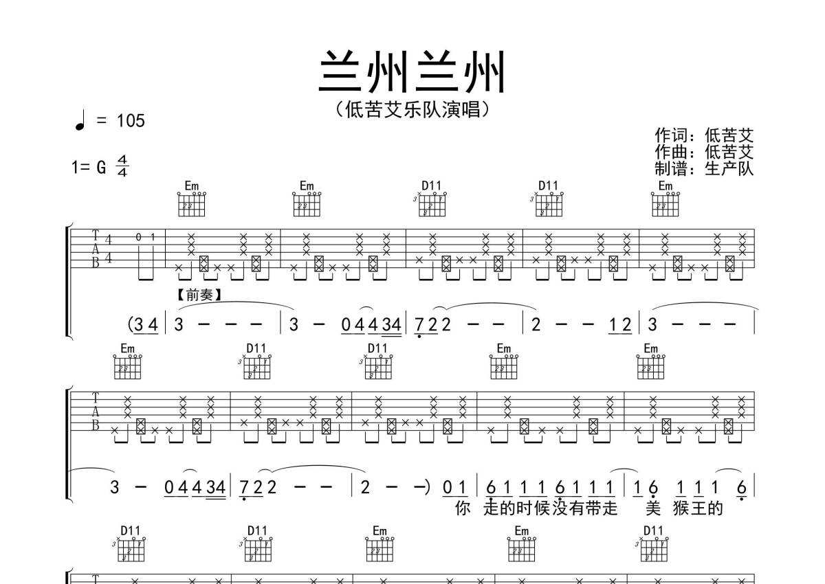 低苦艾乐队《兰州兰州》吉他谱 - G调弹唱六线谱