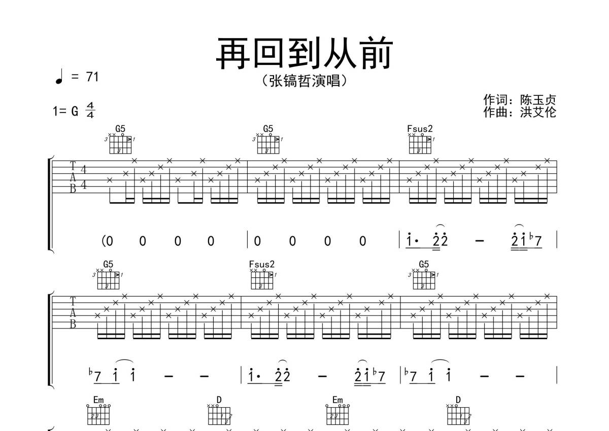 张镐哲《再回到从前》吉他谱 - G调弹唱六线谱