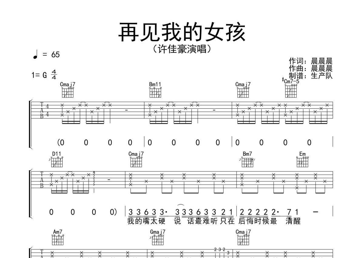 许佳豪《再见我的女孩》吉他谱 - G调弹唱六线谱
