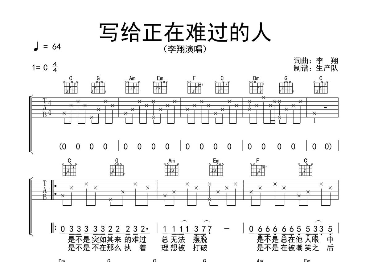 李翔《写给正在难过的人》吉他谱 - C调弹唱六线谱