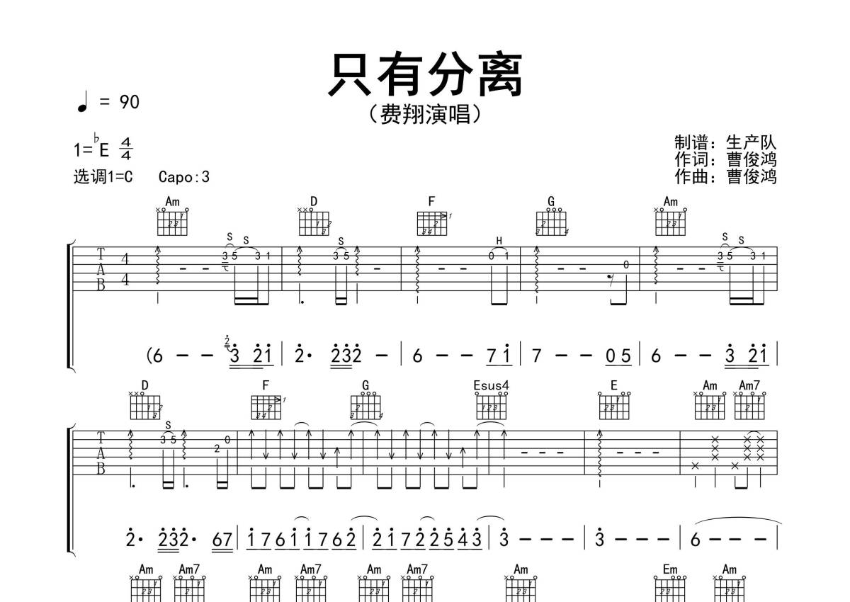 《只有分离》是费翔演唱的一首歌曲,拍号为4/4拍,歌曲速度为每分钟90拍,歌曲原调为Eb调,但由于原调指法比较难,为了方便弹奏,本吉他谱采用的是C调指法编配,变调夹3品弹奏即为原调,当然也可以根据自己的音域改变变调夹位置,或者通过改变和弦调性,以方便自己弹奏,这份吉他谱共有三张高清图谱,图谱由 @生产队 编配上传,图谱使用六线谱编配,包含吉他和弦指法、简谱以及歌词部分,使用这份只有分离吉他谱,可以让你更加方便地掌握这首歌曲的弹唱技巧,快来尝试吧。