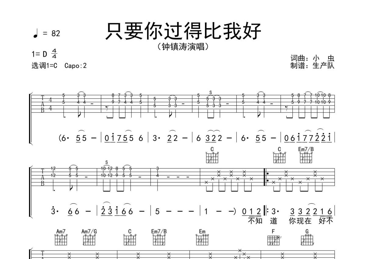 《只要你过得比我好》是钟镇涛演唱的一首歌曲,拍号为4/4拍,歌曲速度为每分钟82拍,歌曲原调为D调,但由于原调指法比较难,为了方便弹奏,本吉他谱采用的是C调指法编配,变调夹2品弹奏即为原调,当然也可以根据自己的音域改变变调夹位置,或者通过改变和弦调性,以方便自己弹奏,这份吉他谱共有三张高清图谱,图谱由 @生产队 编配上传,图谱使用六线谱编配,包含吉他和弦指法、简谱以及歌词部分,使用这份只要你过得比我好吉他谱,可以让你更加方便地掌握这首歌曲的弹唱技巧,快来尝试吧。