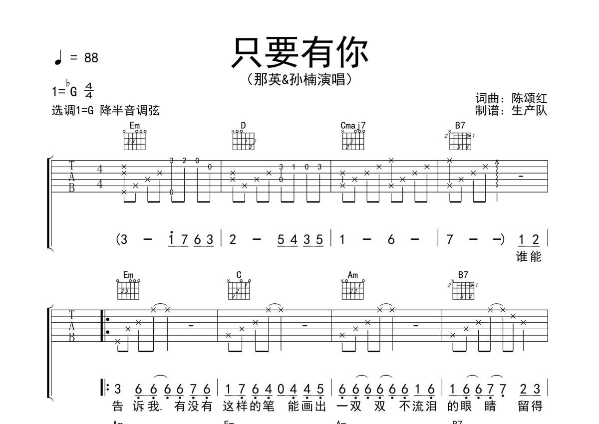 《只要有你》是那英/孙楠演唱的一首歌曲,拍号为4/4拍,歌曲速度为每分钟88拍,歌曲原调为Gb调,但由于原调指法比较难,为了方便弹奏,本吉他谱采用的是G调指法编配,降半音调弦弹奏即为原调,当然也可以根据自己的音域决定是否调弦,这份吉他谱共有三张高清图谱,图谱由 @生产队 编配上传,图谱使用六线谱编配,包含吉他和弦指法、简谱以及歌词部分,使用这份只要有你吉他谱,可以让你更加方便地掌握这首歌曲的弹唱技巧,快来尝试吧。