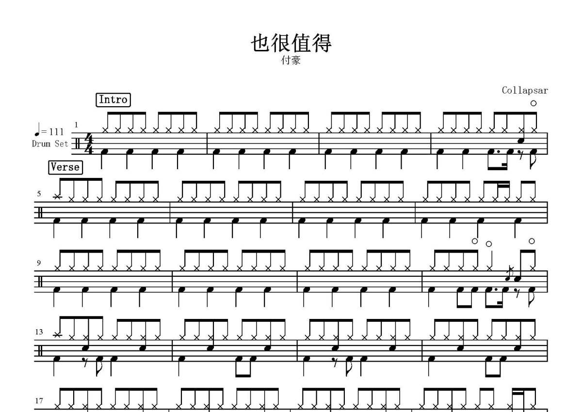 付豪《也很值得》鼓谱 - 架子鼓谱