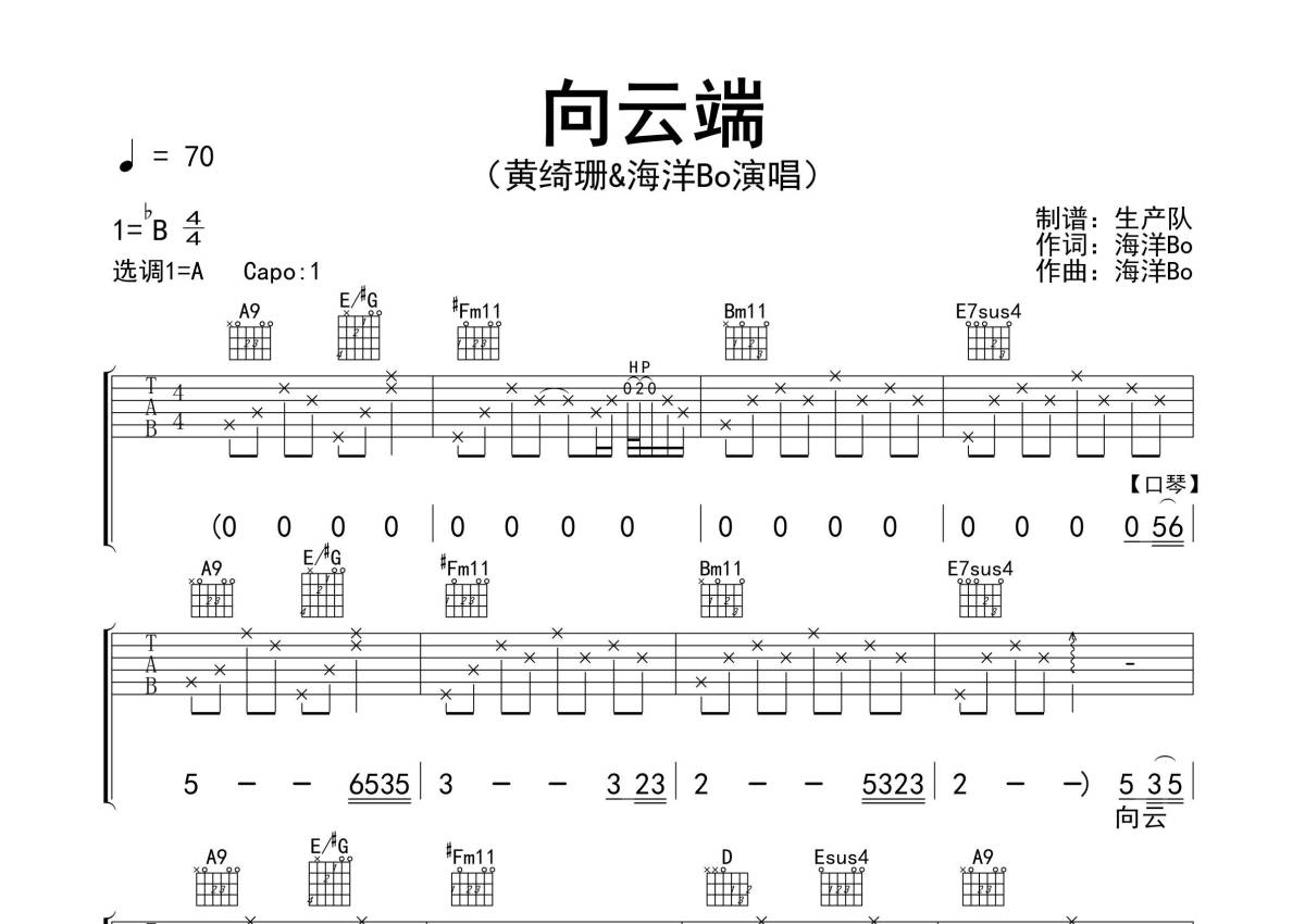 《向云端》是黄绮珊/海洋bo演唱的一首歌曲,拍号为4/4拍,歌曲速度为每分钟70拍,歌曲原调为Bb调,但由于原调指法比较难,为了方便弹奏,本吉他谱采用的是G调指法编配,变调夹1品弹奏即为原调,当然也可以根据自己的音域改变变调夹位置,或者通过改变和弦调性,以方便自己弹奏,这份吉他谱共有三张高清图谱,图谱由 @生产队 编配上传,图谱使用六线谱编配,包含吉他和弦指法、简谱以及歌词部分,使用这份向云端吉他谱,可以让你更加方便地掌握这首歌曲的弹唱技巧,快来尝试吧。