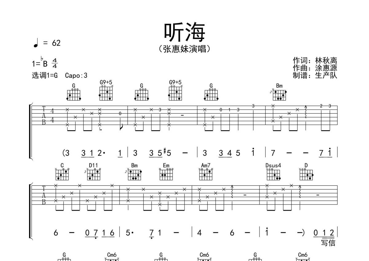 《听海》是张惠妹演唱的一首歌曲,拍号为4/4拍,歌曲速度为每分钟62拍,歌曲原调为Bb调,但由于原调指法比较难,为了方便弹奏,本吉他谱采用的是G调指法编配,变调夹3品弹奏即为原调,当然也可以根据自己的音域改变变调夹位置,或者通过改变和弦调性,以方便自己弹奏,这份吉他谱共有三张高清图谱,图谱由 @生产队 编配上传,图谱使用六线谱编配,包含吉他和弦指法、简谱以及歌词部分,使用这份听海吉他谱,可以让你更加方便地掌握这首歌曲的弹唱技巧,快来尝试吧。