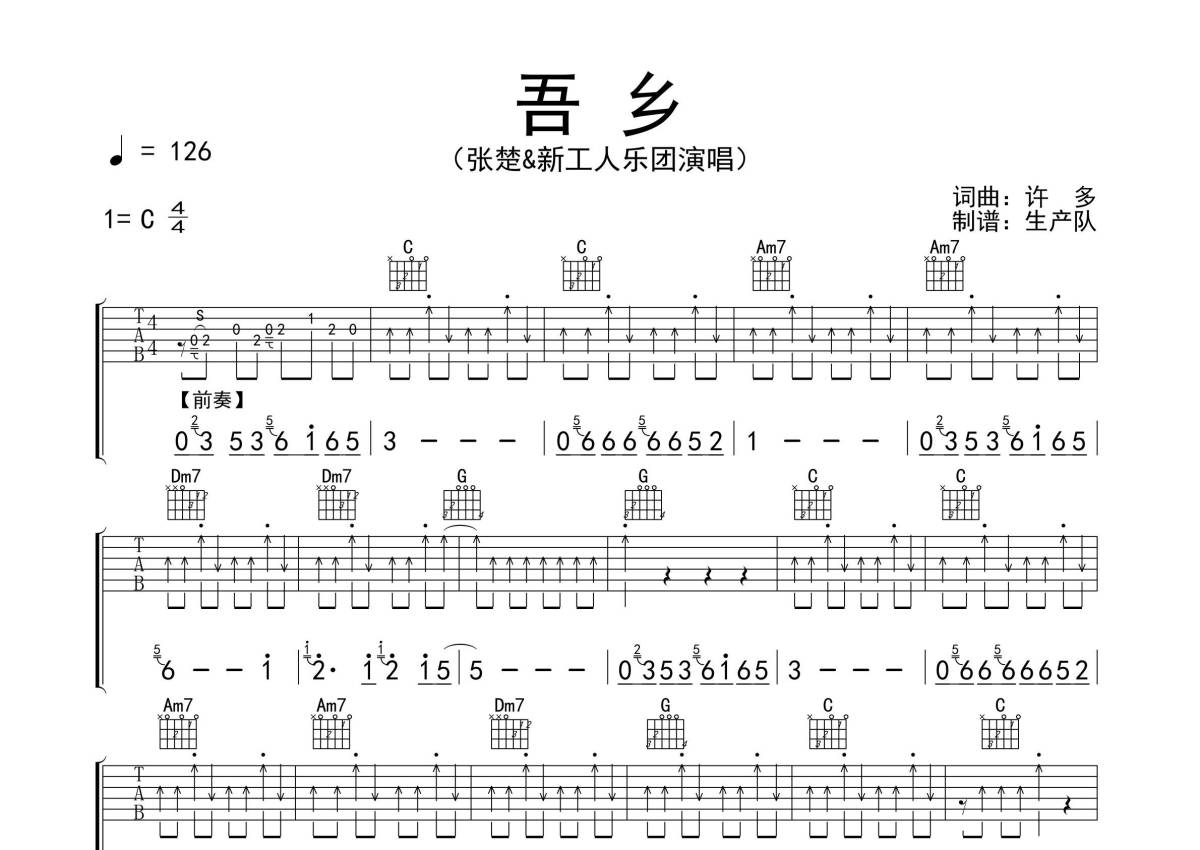 张楚/新工人乐团《吾乡》吉他谱 - C调弹唱六线谱