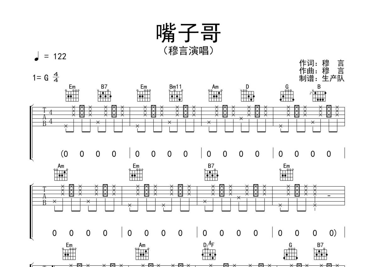 穆言《嘴子哥》吉他谱 - G调弹唱六线谱