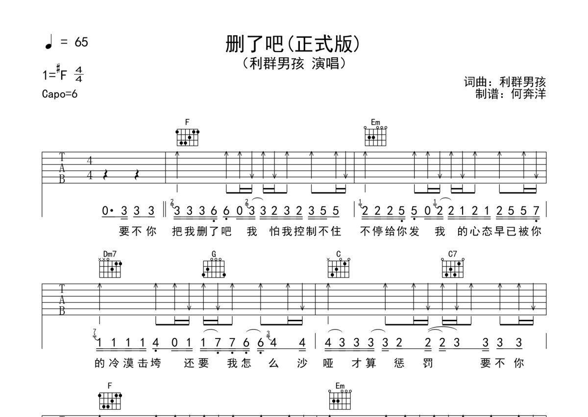 利群男孩《删了吧》吉他谱 - C调弹唱六线谱