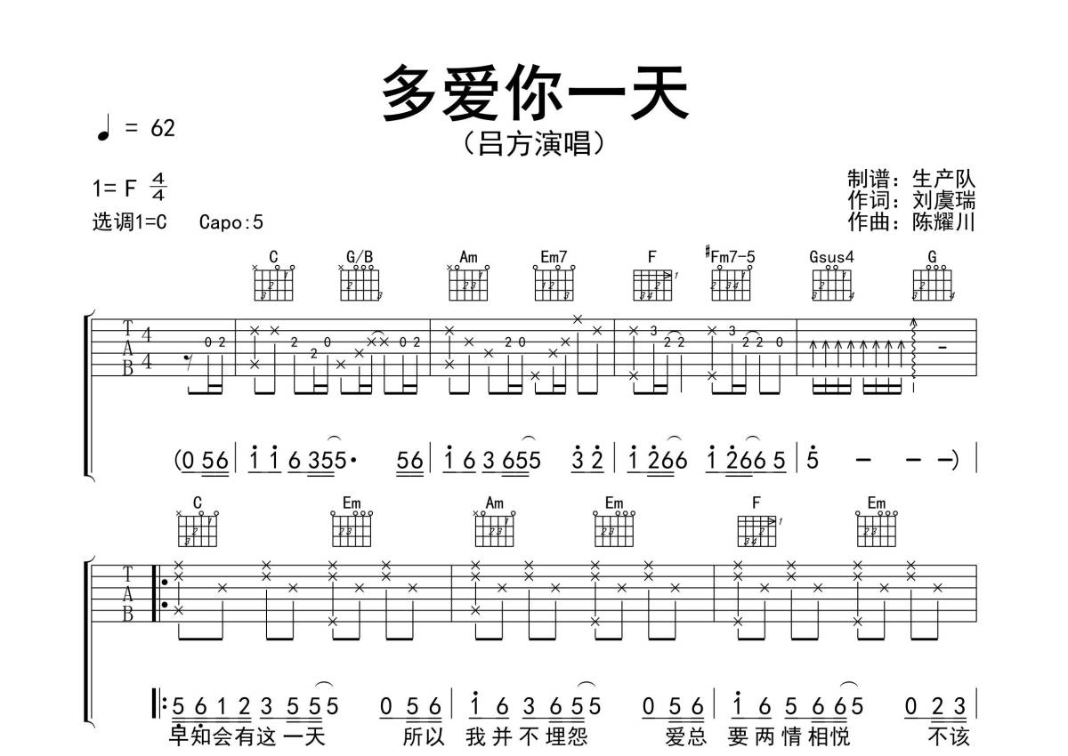 吕方《多爱你一天》吉他谱 - C调弹唱六线谱