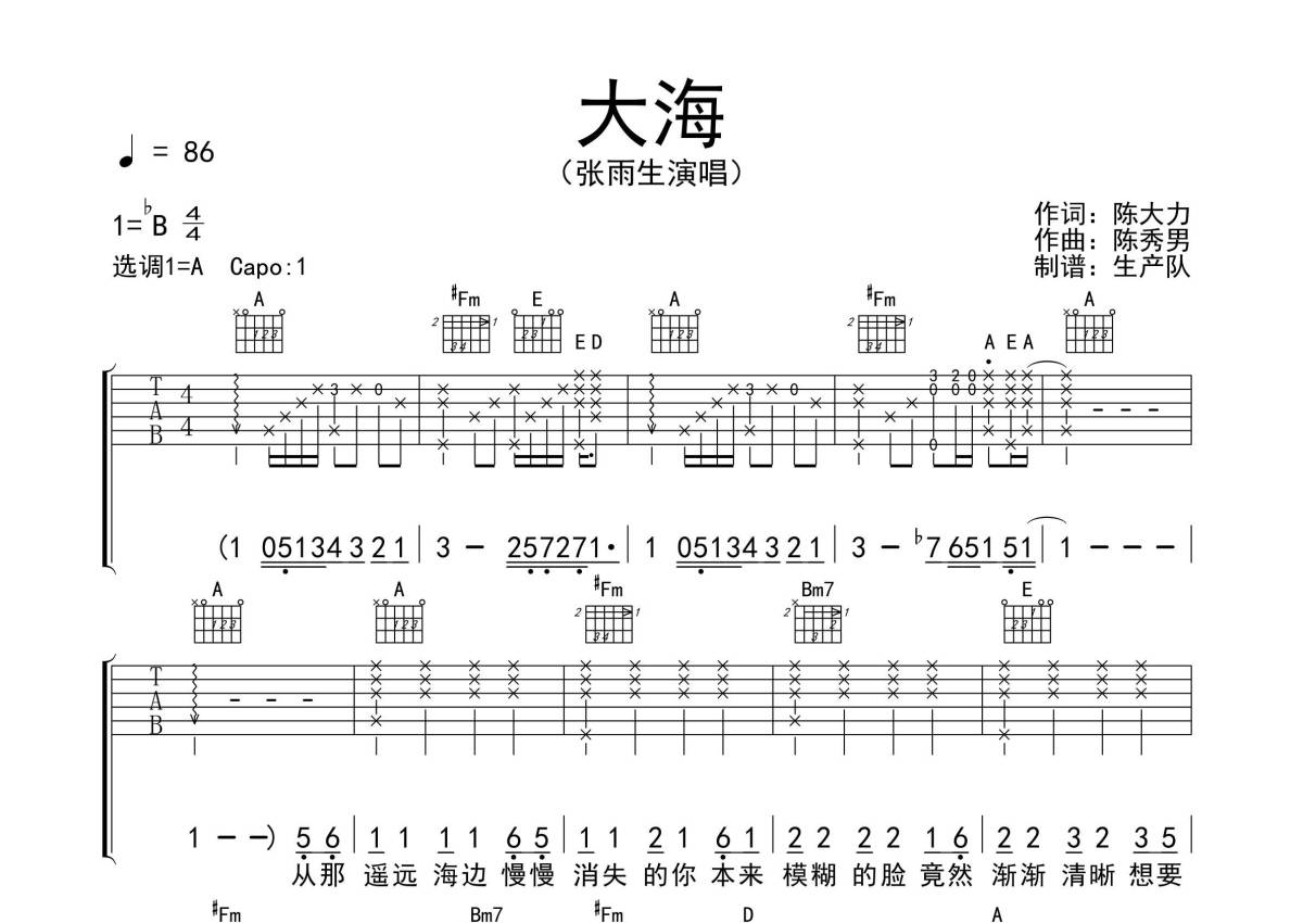 张雨生《大海》吉他谱 - A调弹唱六线谱